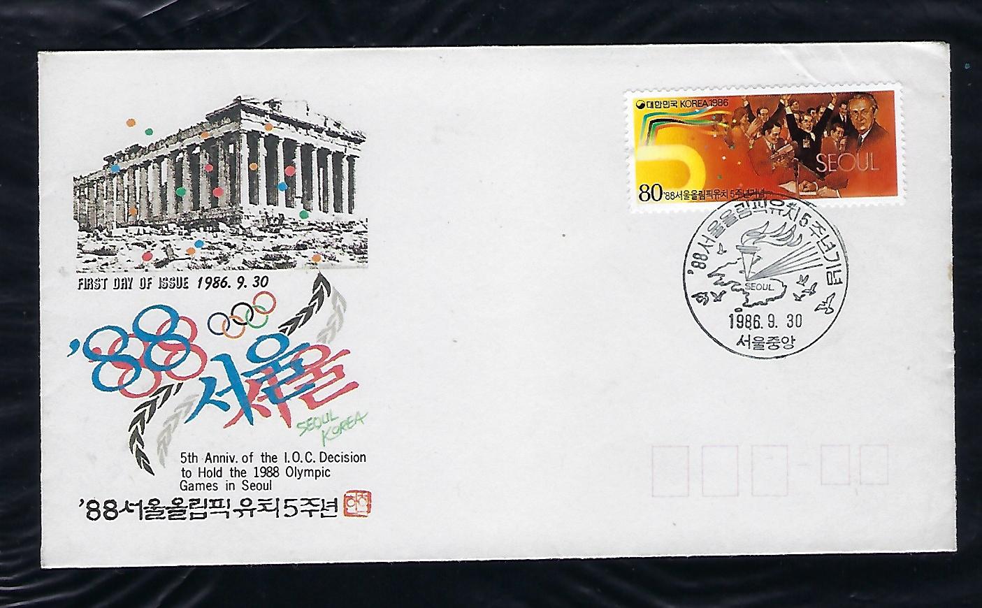1986년 88 서울 올림픽 유치 5주년 안내 카드 포함 초일 봉투(FDC)