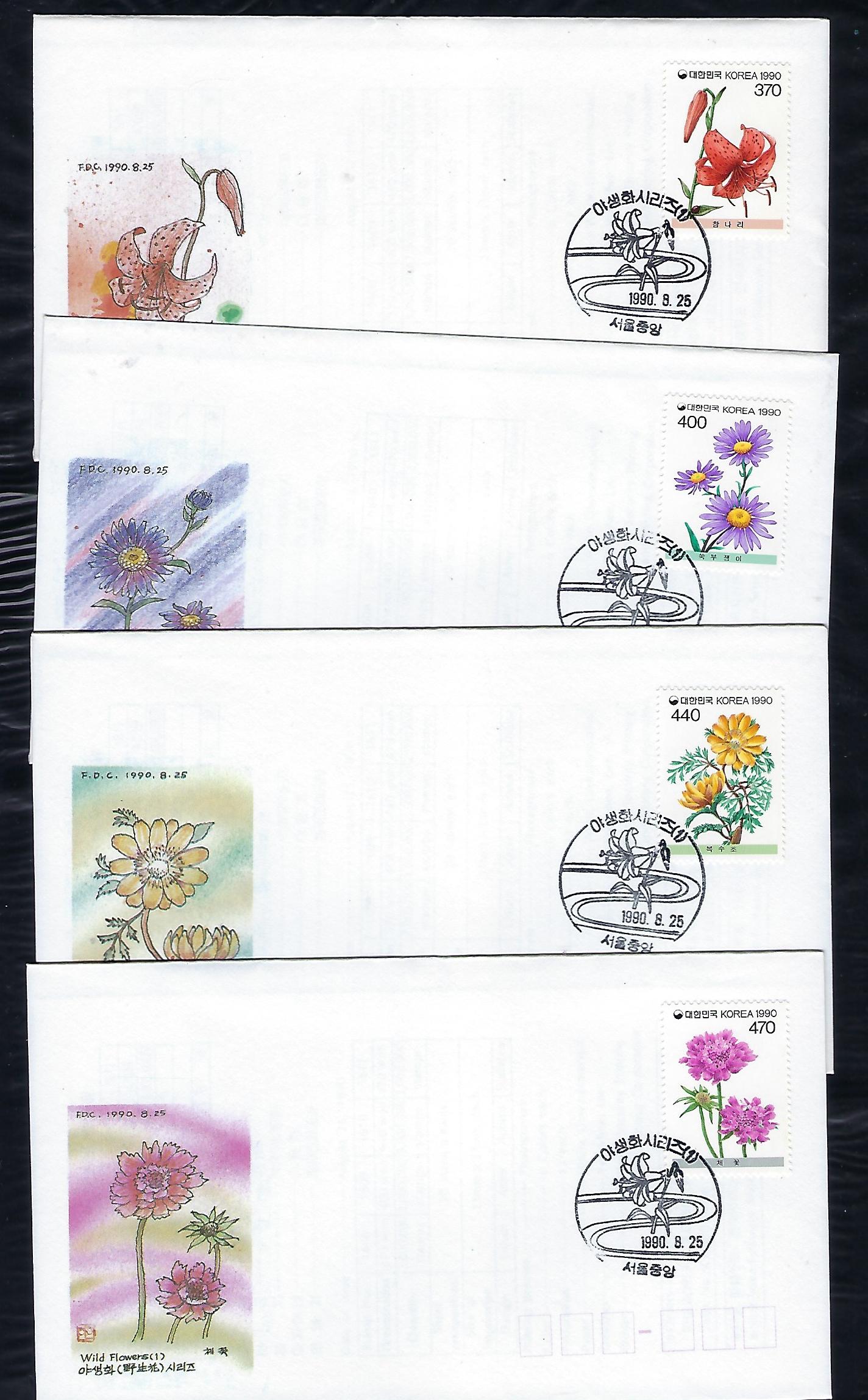 1990년 야생화 시리즈 제 1 집 안내 카드 포함 초일 봉투(FDC) 4완