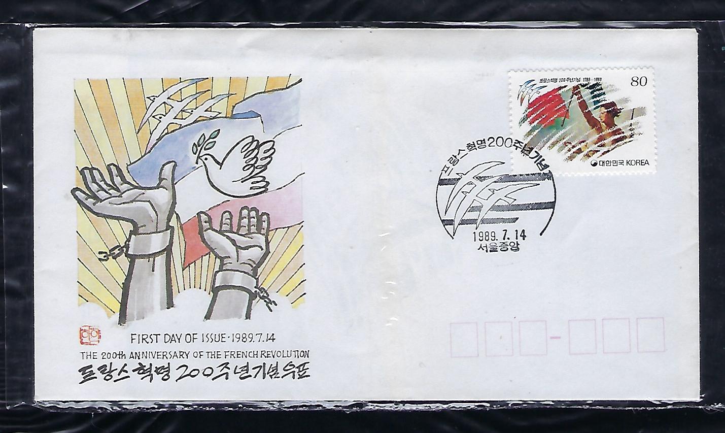 1989년 프랑스 혁명 200 주년 우표 안내 카드 포함 초일 봉투(FDC)