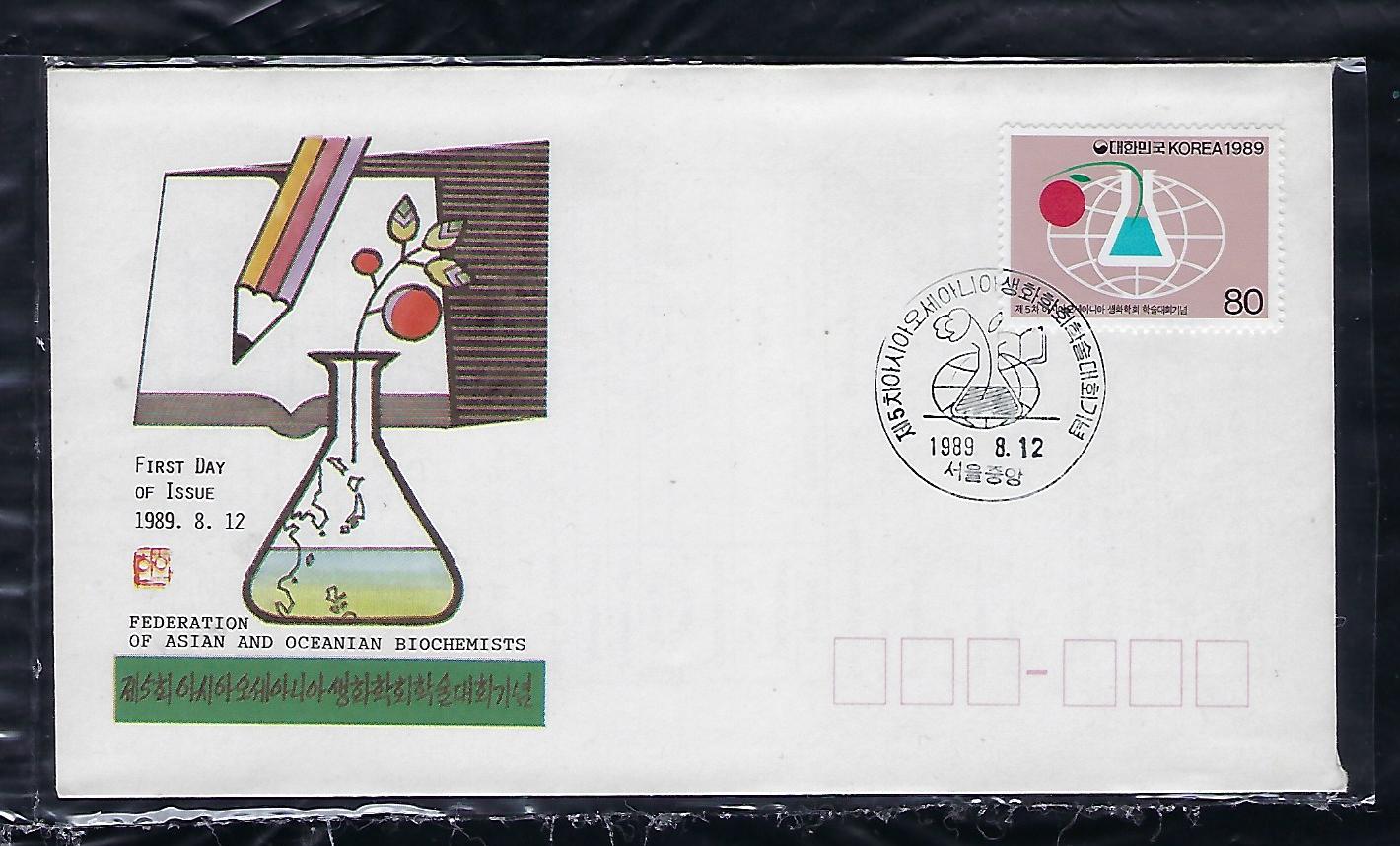 1989년 제 5차 아시아 오세아니아 생화학 학술 대회 우표 안내 카드 포함 초일 봉투(FDC)