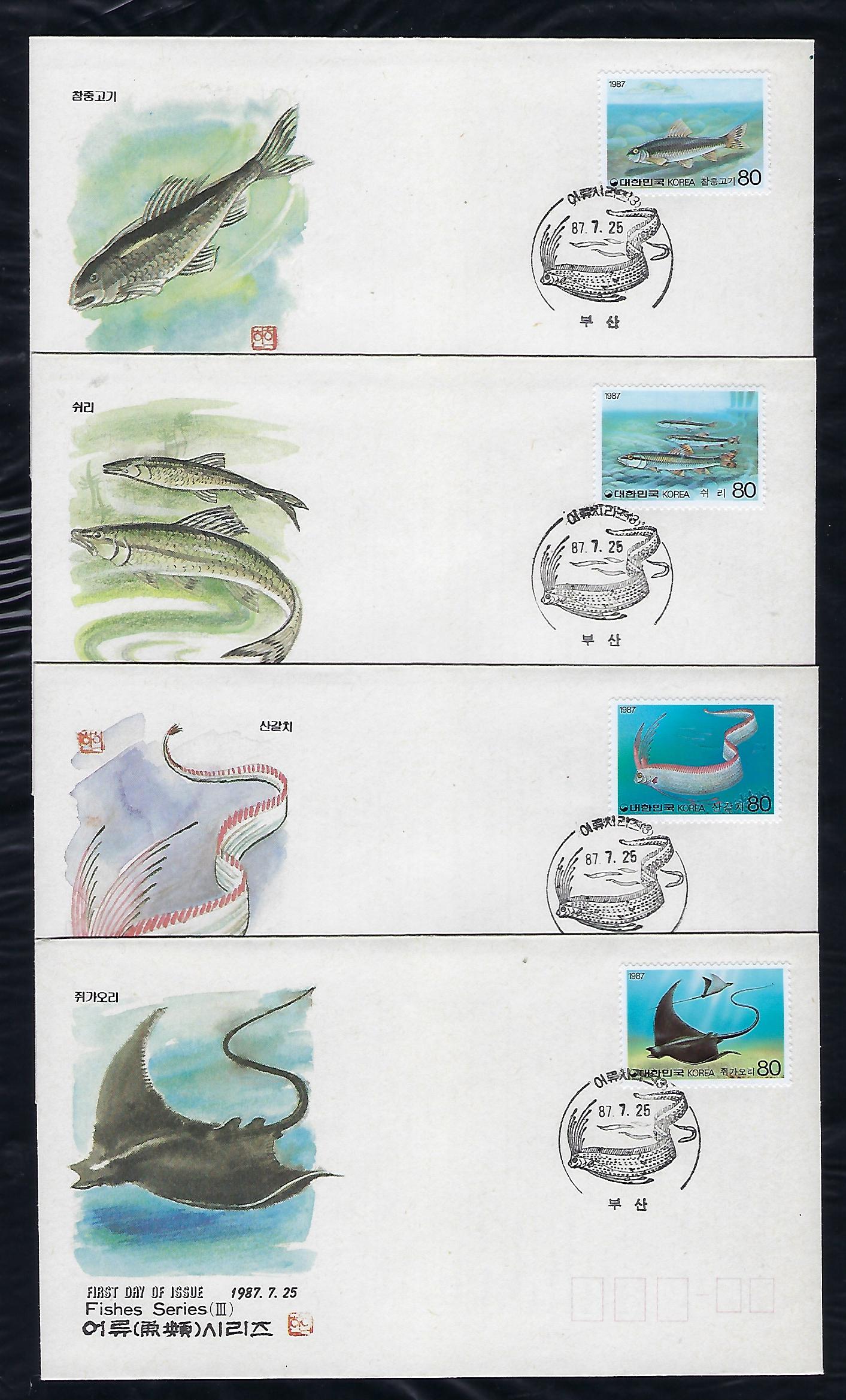 1987년 어류 시리즈 제 3 집 안내 카드 포함 초일 봉투(FDC) 4완