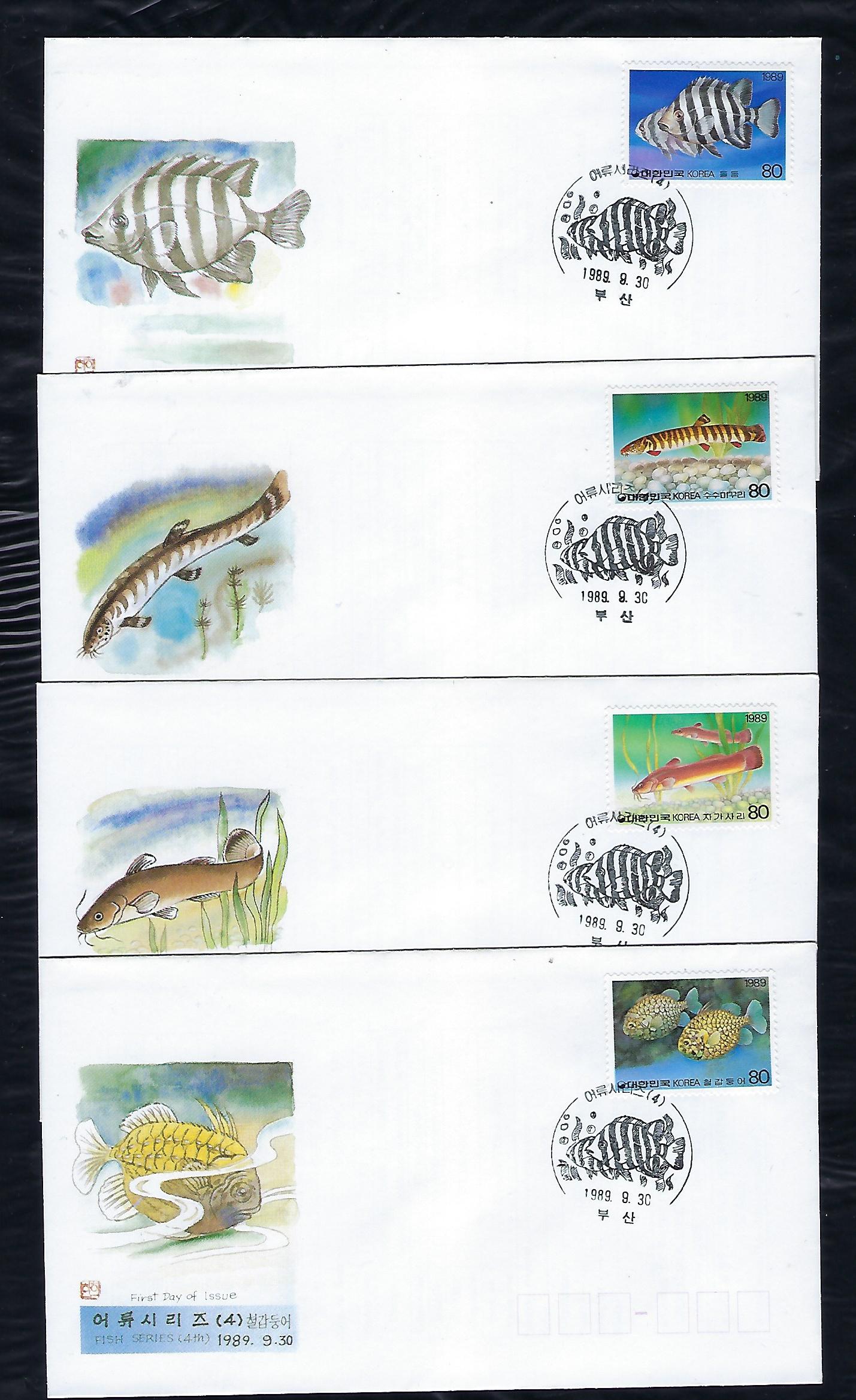1989년 어류 시리즈 제 4 집 안내 카드 포함 초일 봉투(FDC) 4완