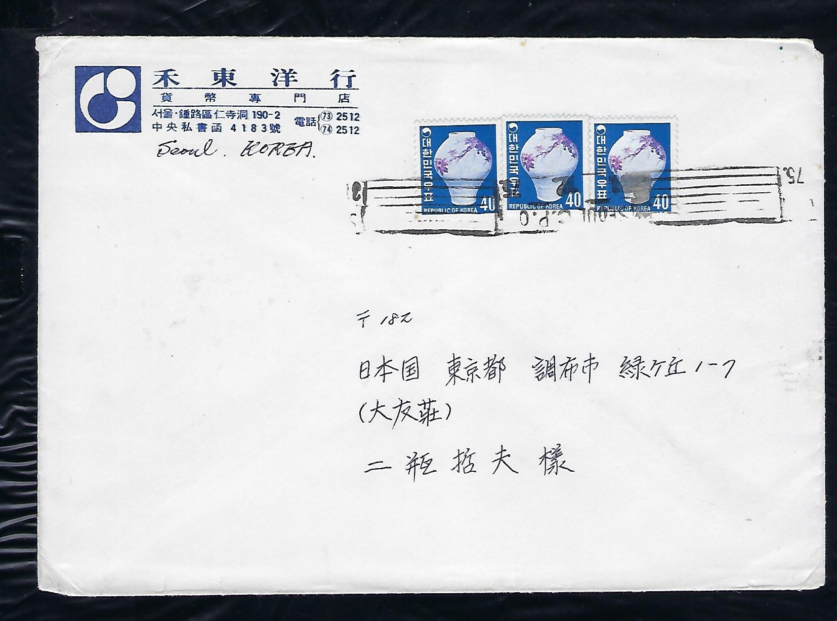 > 전체카테고리 > 한국우표 제1차 그라비아 보통 40원 조선백자 3장 실체봉피입니다.