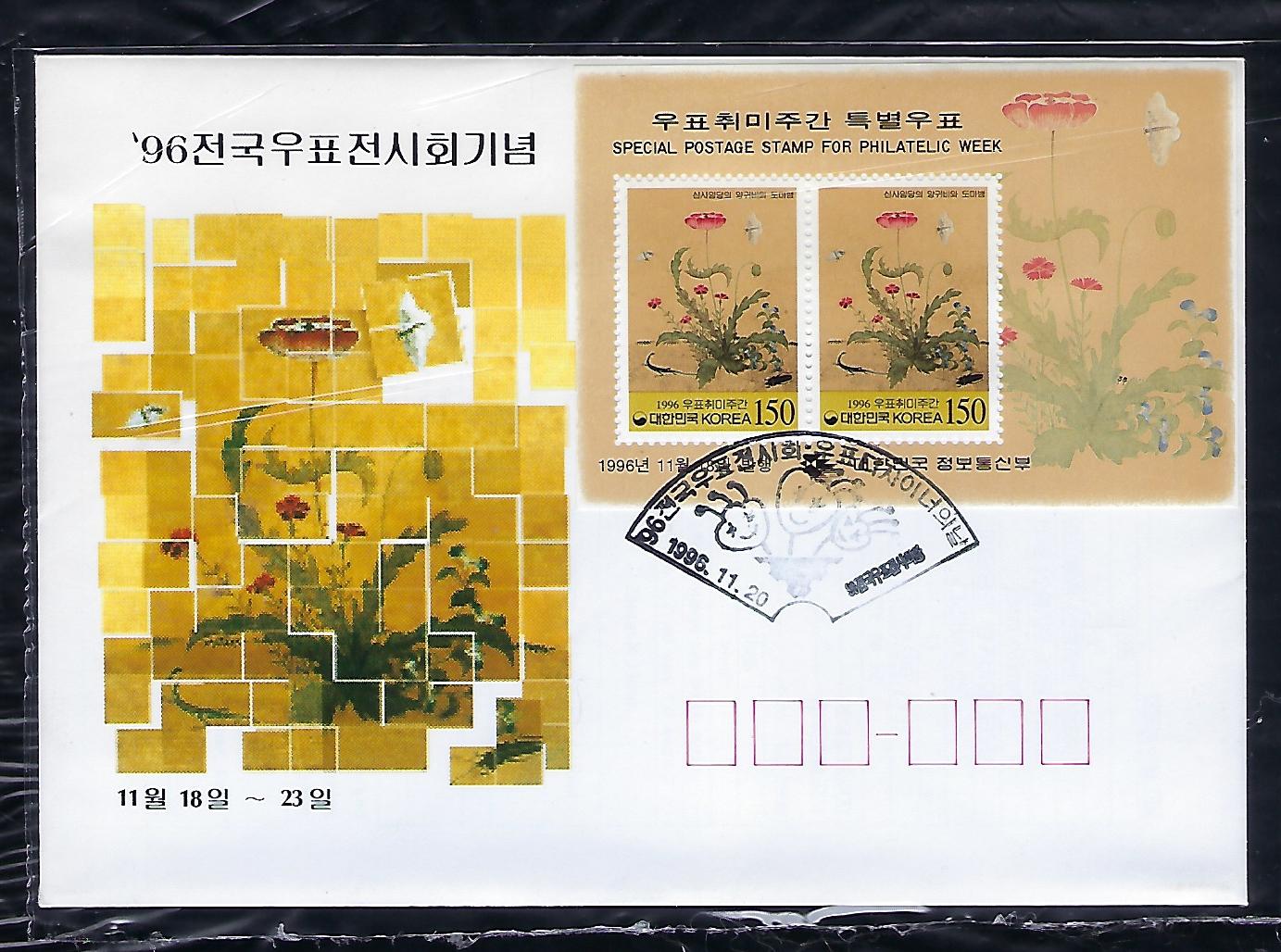 1996년 우표 취미주간 시트 우표 안내 카드 포함 초일 봉투(FDC)
