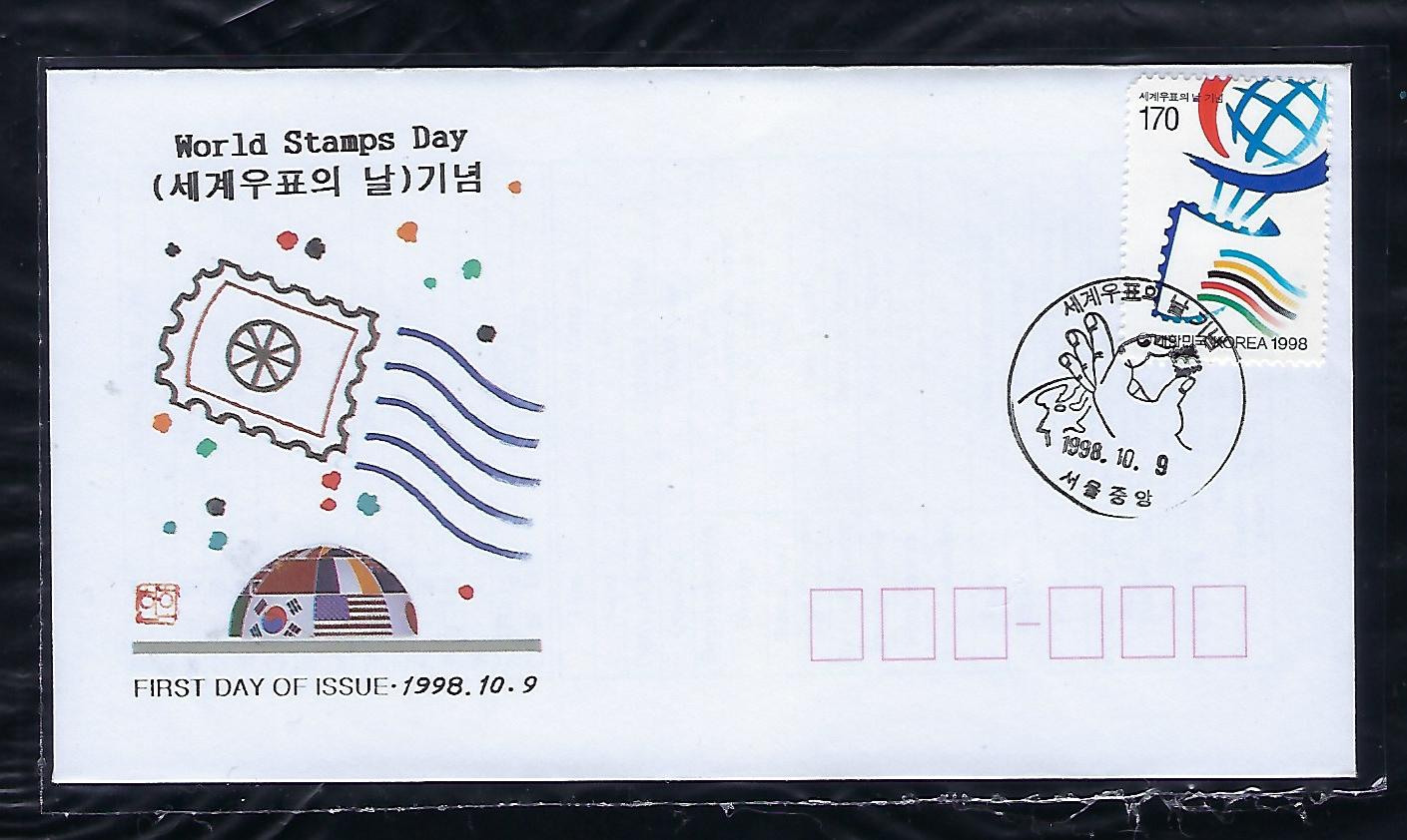 1998년 세계 우표의 날 기념 우표 안내 카드 포함 초일 봉투(FDC)로  상태는 사진과 같이 아주 좋습니다.