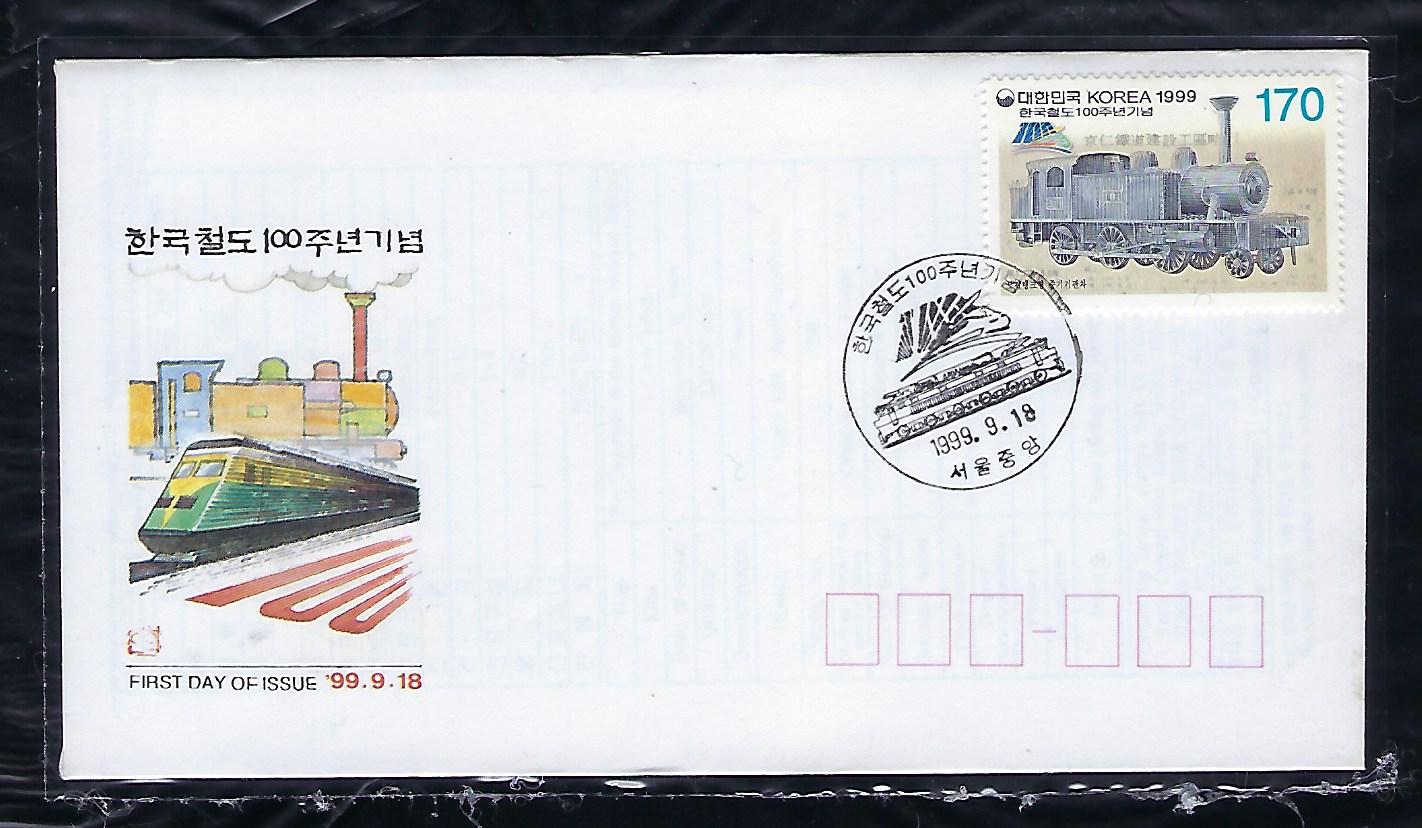 1999년 한국 철도 100주년 우표 안내 카드 포함 초일 봉투(FDC)