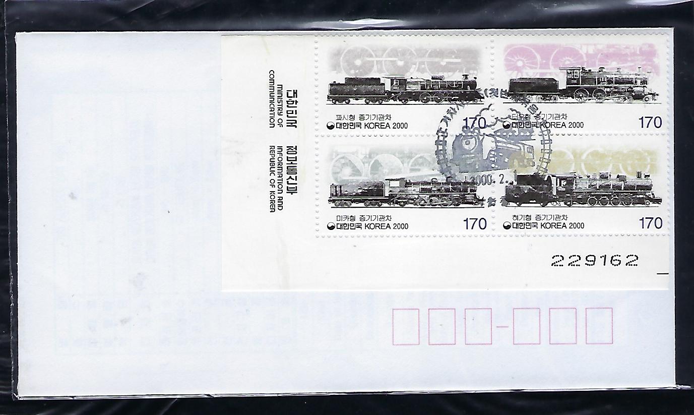 > 전체카테고리 > 한국우표 2000년 기차 시리즈 (제1집) 4완 우표 안내 카드 포함 초일 봉투(FDC)로 상태는 사진과 같이 아주 좋습니다.