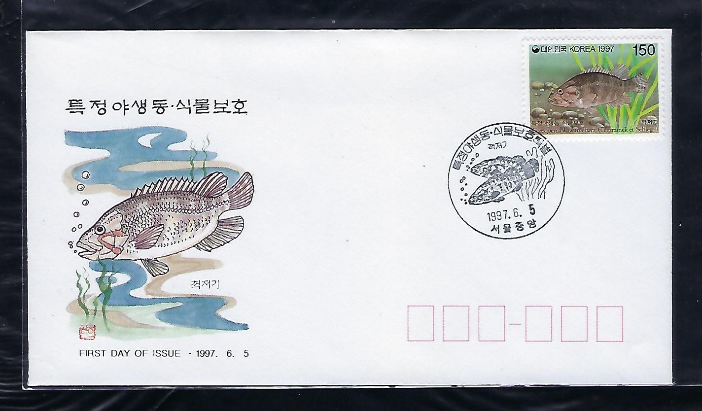 > 전체카테고리 > 한국우표 1997년 특정 야생동-식물 보호특별(제4집) 꺽저기 우표 초일 봉투(FDC)로 상태는 사진과 같이 아주 좋습니다.