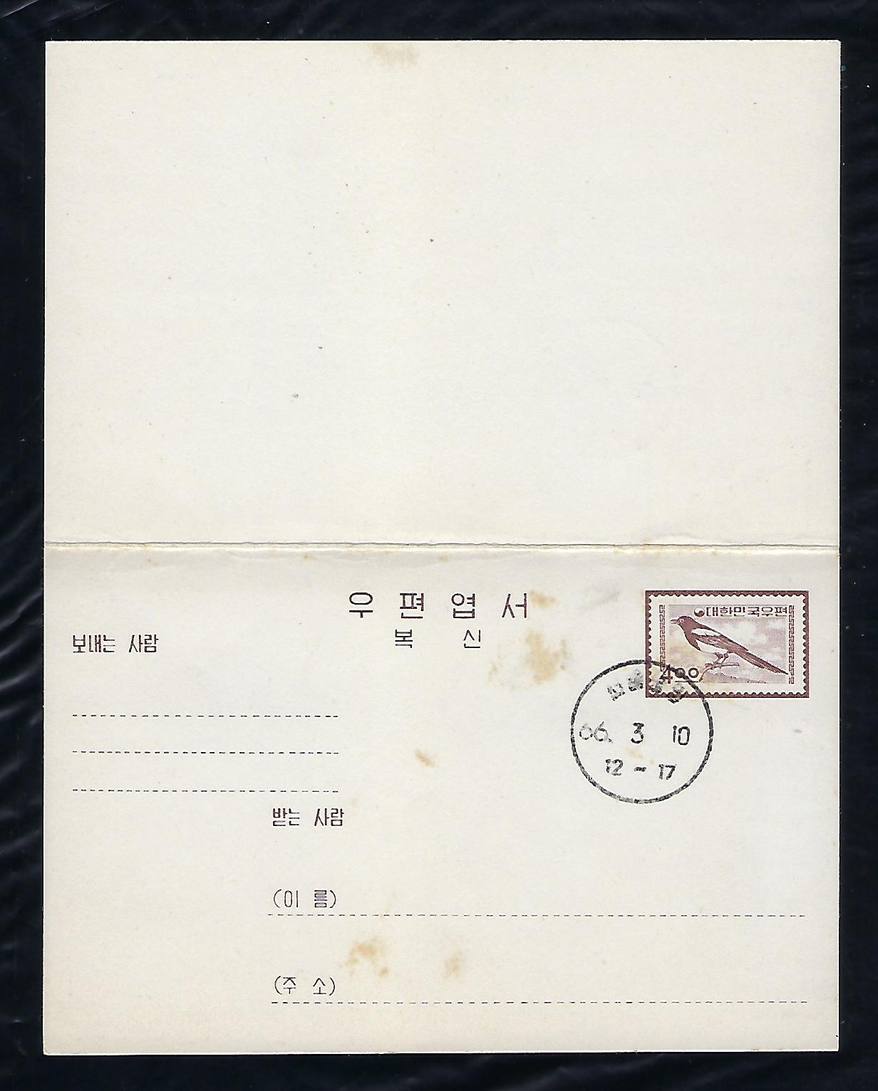 1966년 3월10일 8원 까치 왕복 엽서 초일 소인