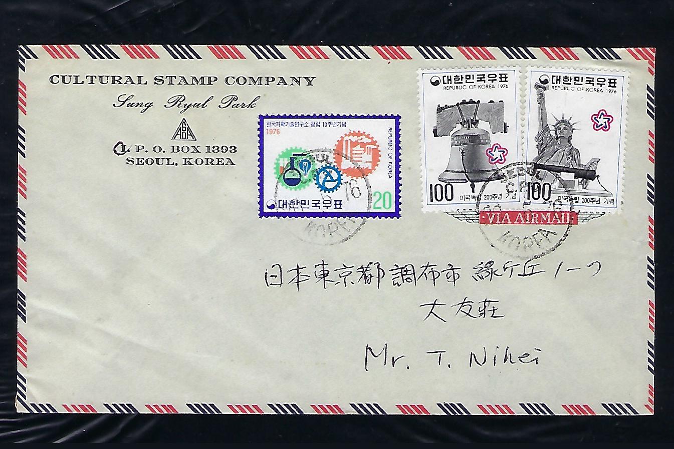 미독립 자유의 종.자유의 여신 2장 과 한국과학기술 연구소 10년우표 실체봉피