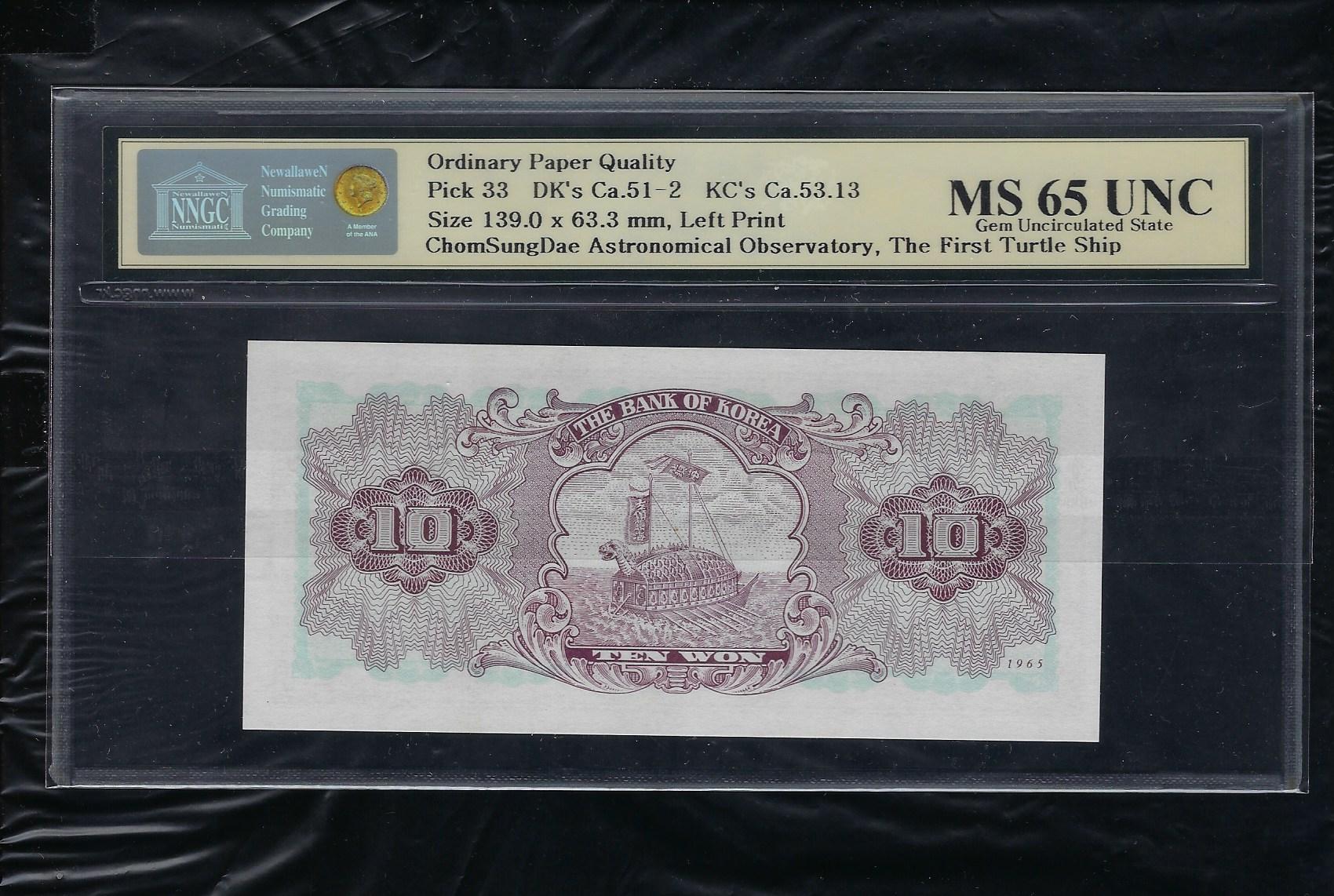 한국은행 나 10 원권 1965년 78판으로 상태는 사진에서 보시는 봐와 같이 더 설명이 필요없는 상위 완전미사용품 NNGC MS 65 UNC등급입니다.