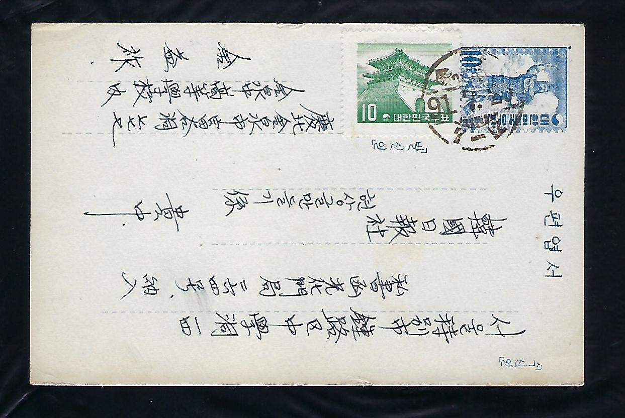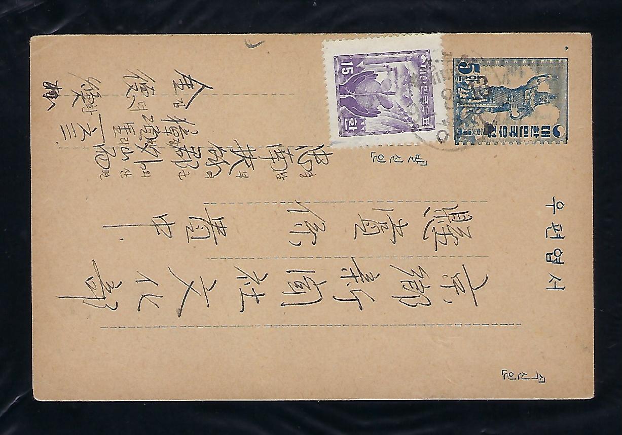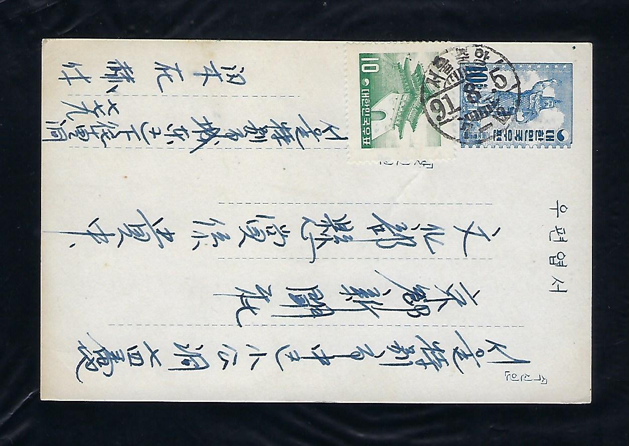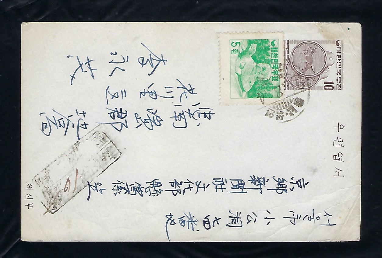 10환 을지문덕 엽서에 10환 남대문 우표 첨부 실체