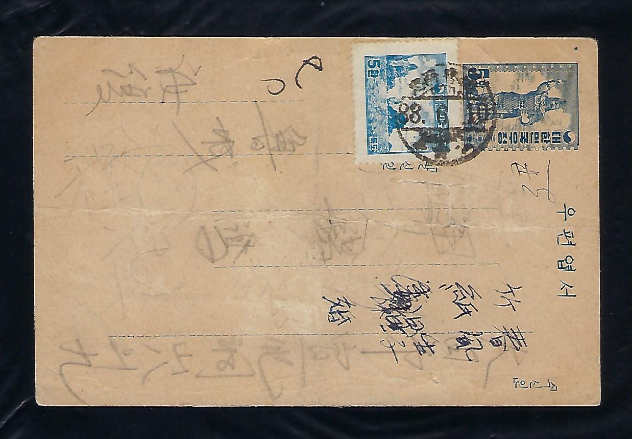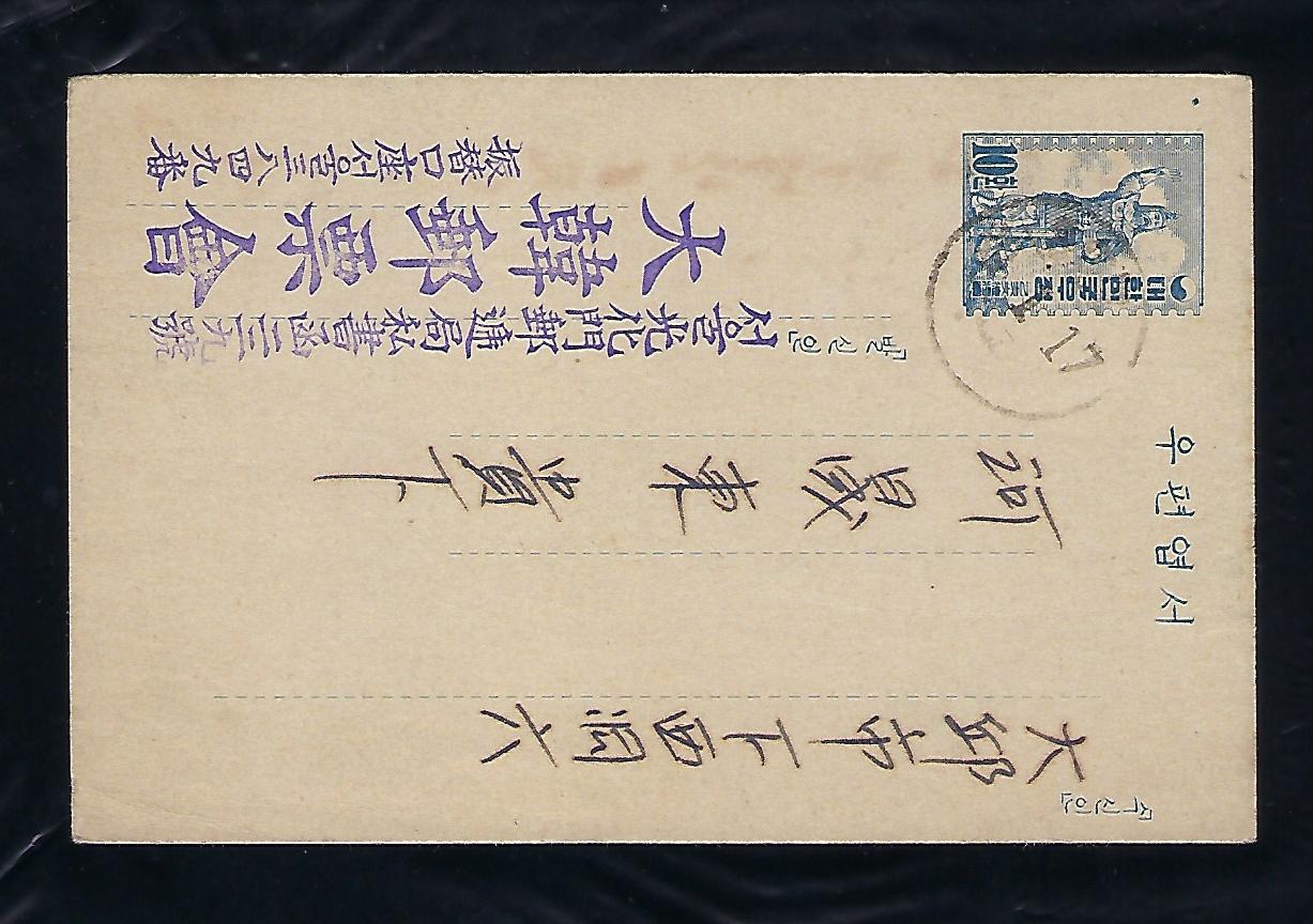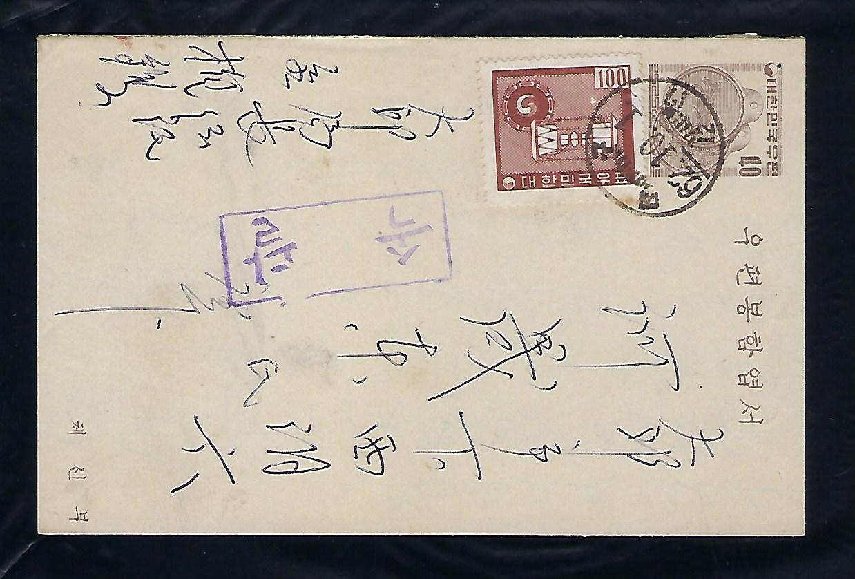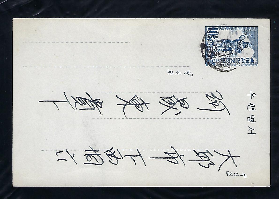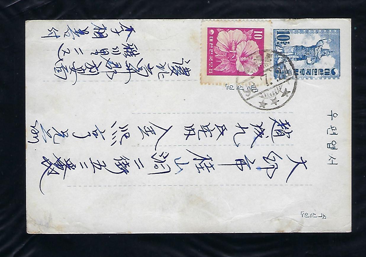 10환 을지문덕 엽서에 10환 남대문 우표 첨부 실체
