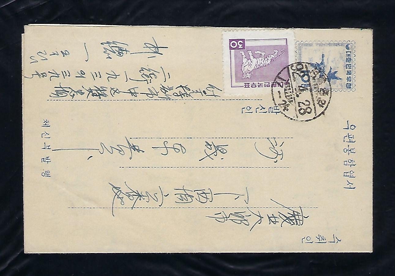 10환 기러기 봉함엽서에 30환 호랑이 우표첨부 엽서 실체